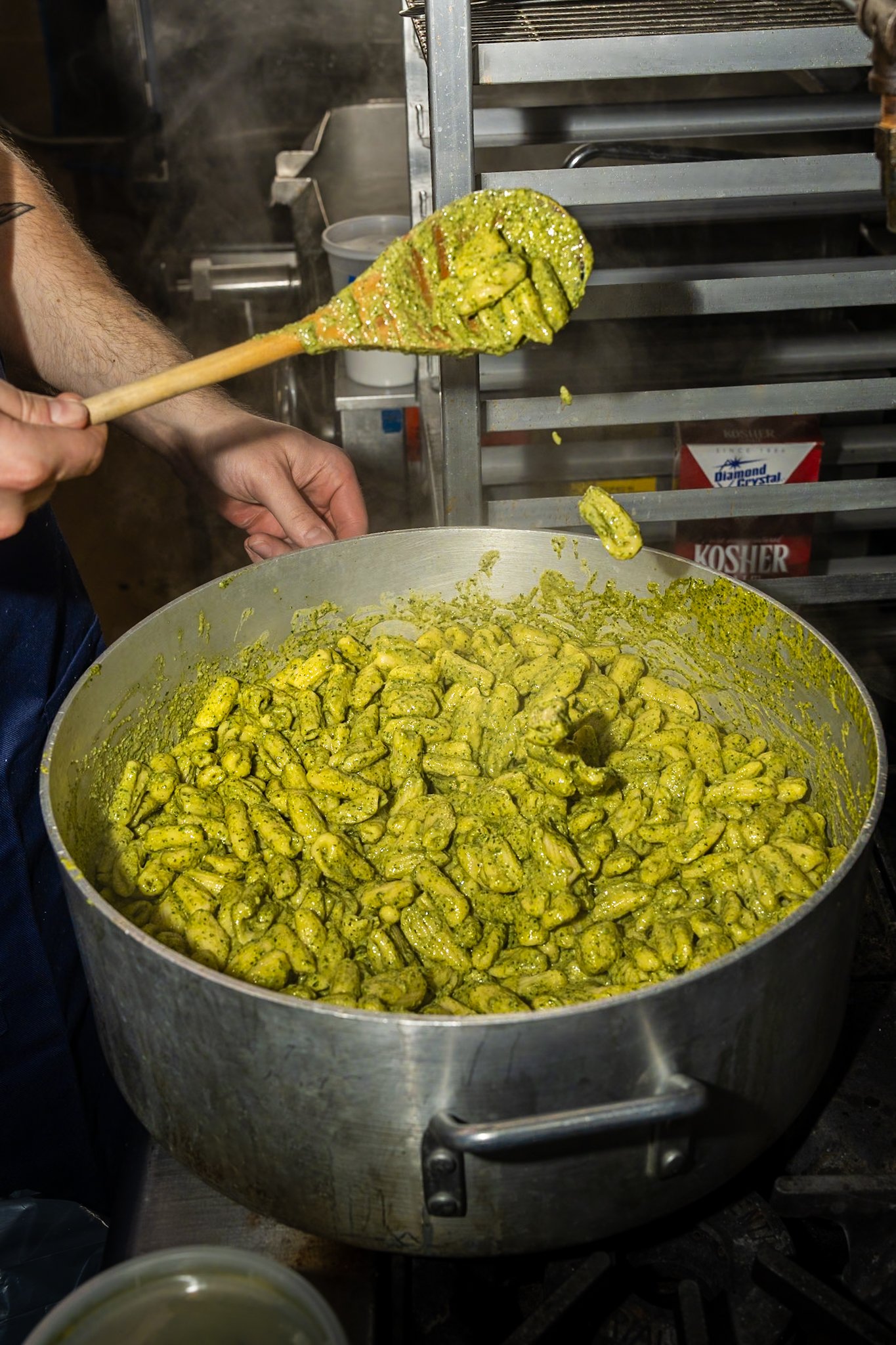 Blend pine nuts, parm, and blanched kale in a food processor.