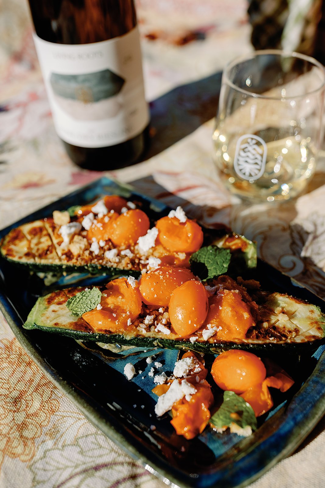 charred zucchini + sungold tomato, mint, ricotta salata, toasted breadcrumbs