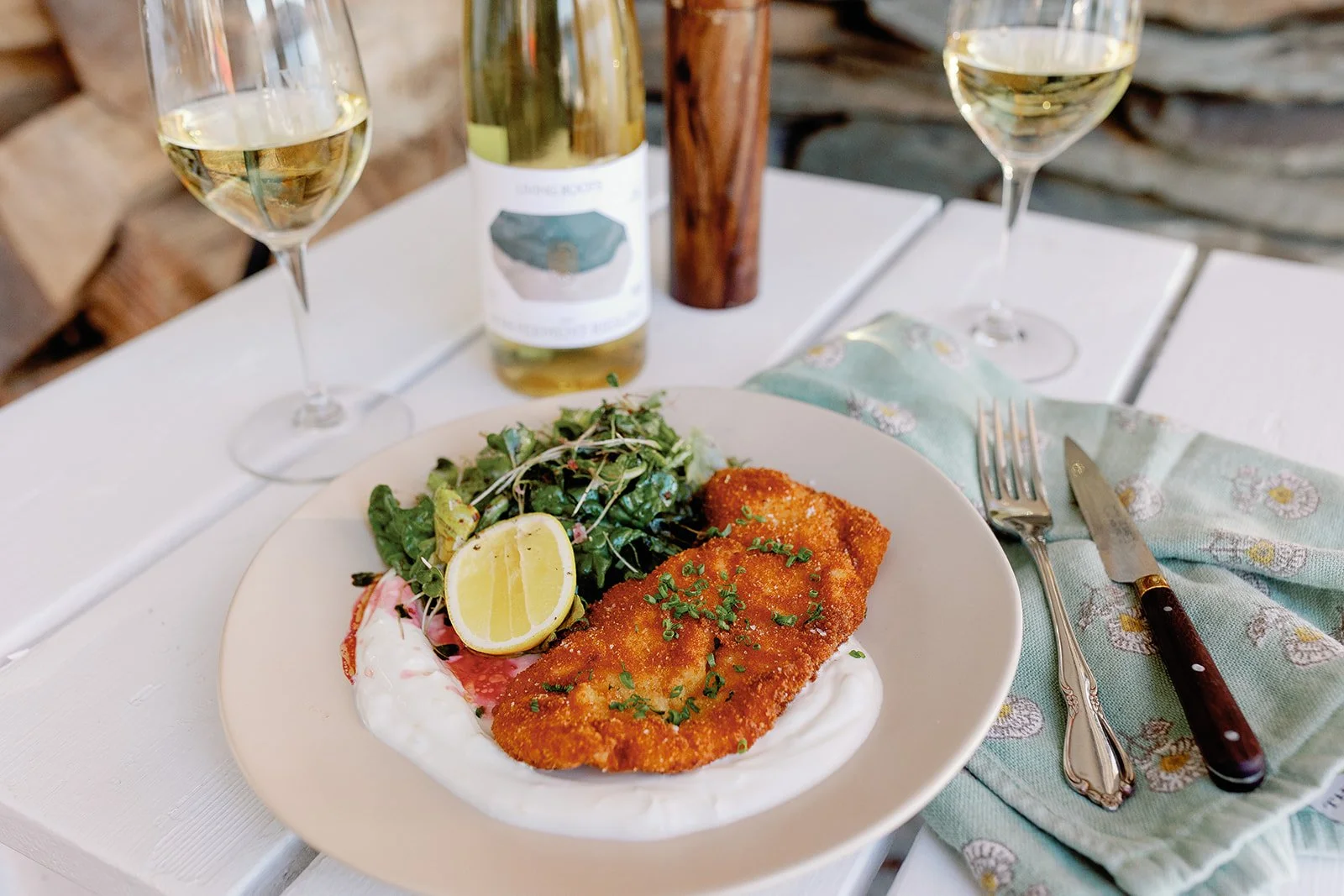 chicken cutlets over whipped lemony yogurt, spring green salad
